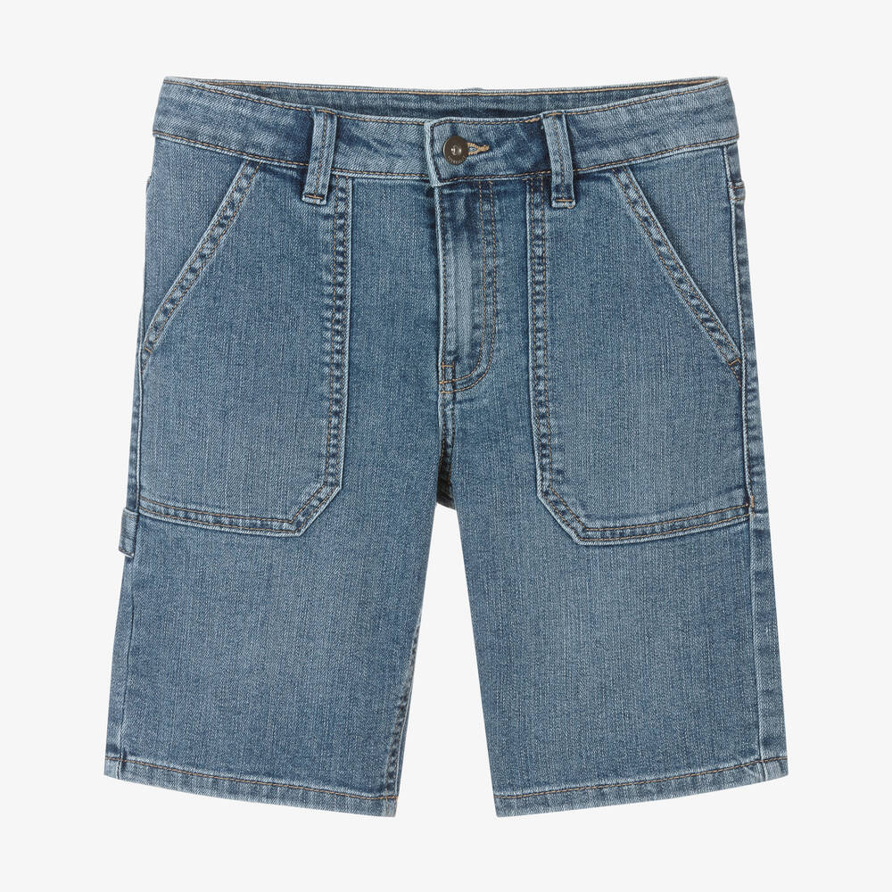 Blue denim shorts for older boys by Mayoral Nukutavake, with a washed and worn look. Bermuda length, they are made in comfortable, stretchy cotton with an adjustable waist for the ideal fit. They are designed with a hammer loop on one of the back pockets, inspired by the silhouette of classic work trousers.