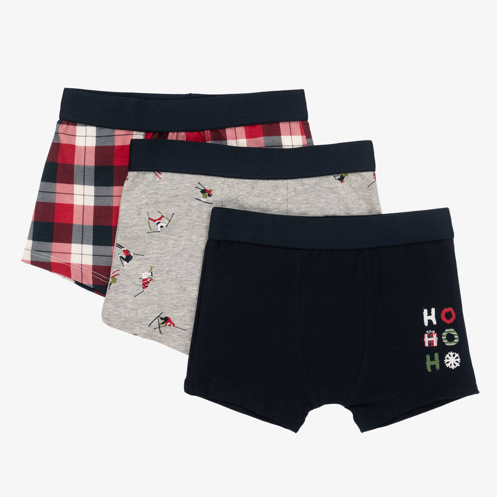 Pack of three boxer shorts for boys by Mayoral. They are made in comfortable cotton and viscose blend jersey with a navy blue elasticated waistband. One pair is navy blue with 'Ho Ho Ho' printed on one leg for a festive feel. One pair is in a red, white and blue checked pattern. The last pair is grey marl with a cute and colourful ski-inspired print.