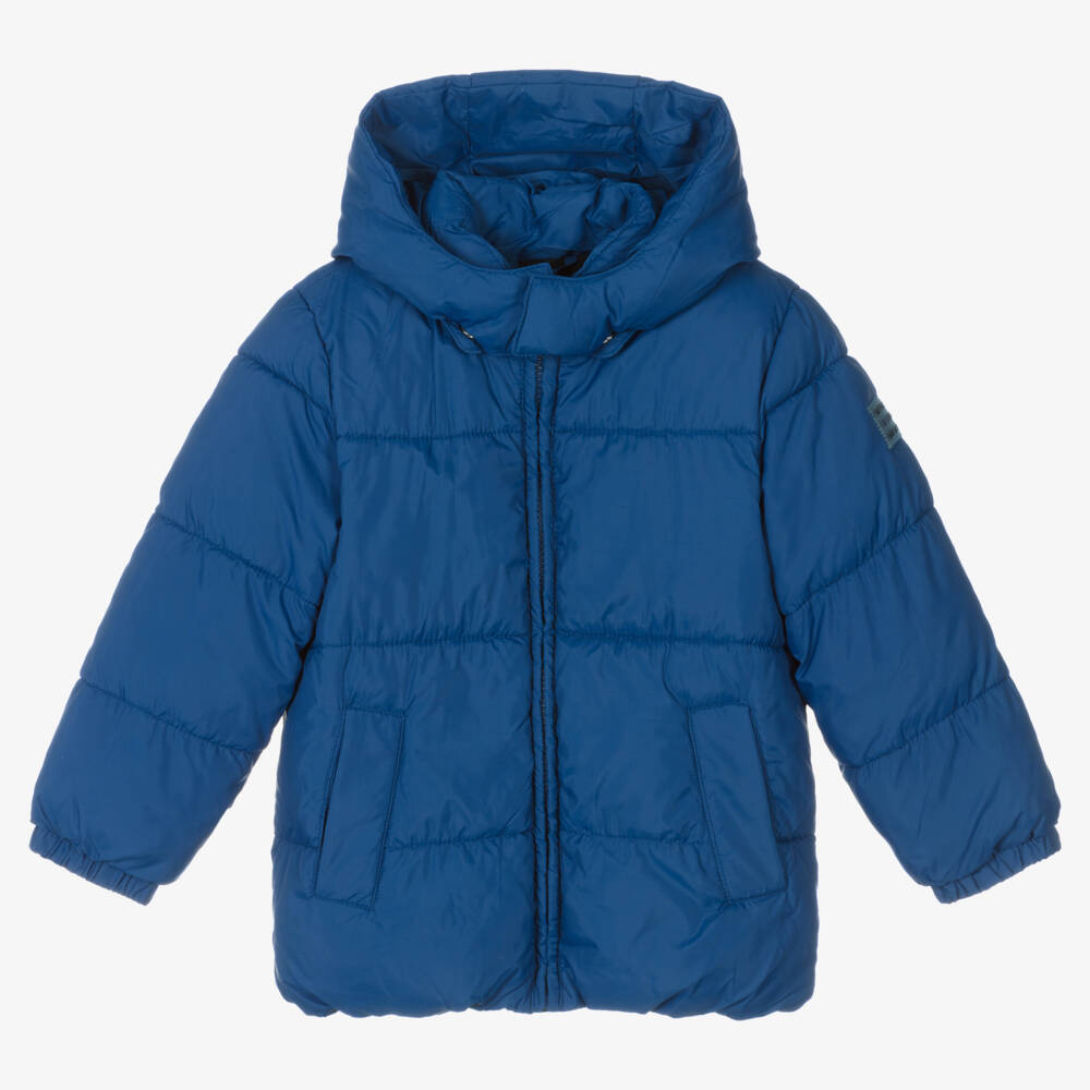 A blue puffer coat for boys by Mayoral, made in a silky smooth fabric. This practical zip-up coat has a detachable hood that fastens with poppers, keeping them covered in wind and rain. It has a fleece-lined bodice and pockets, with smooth-lined sleeves.