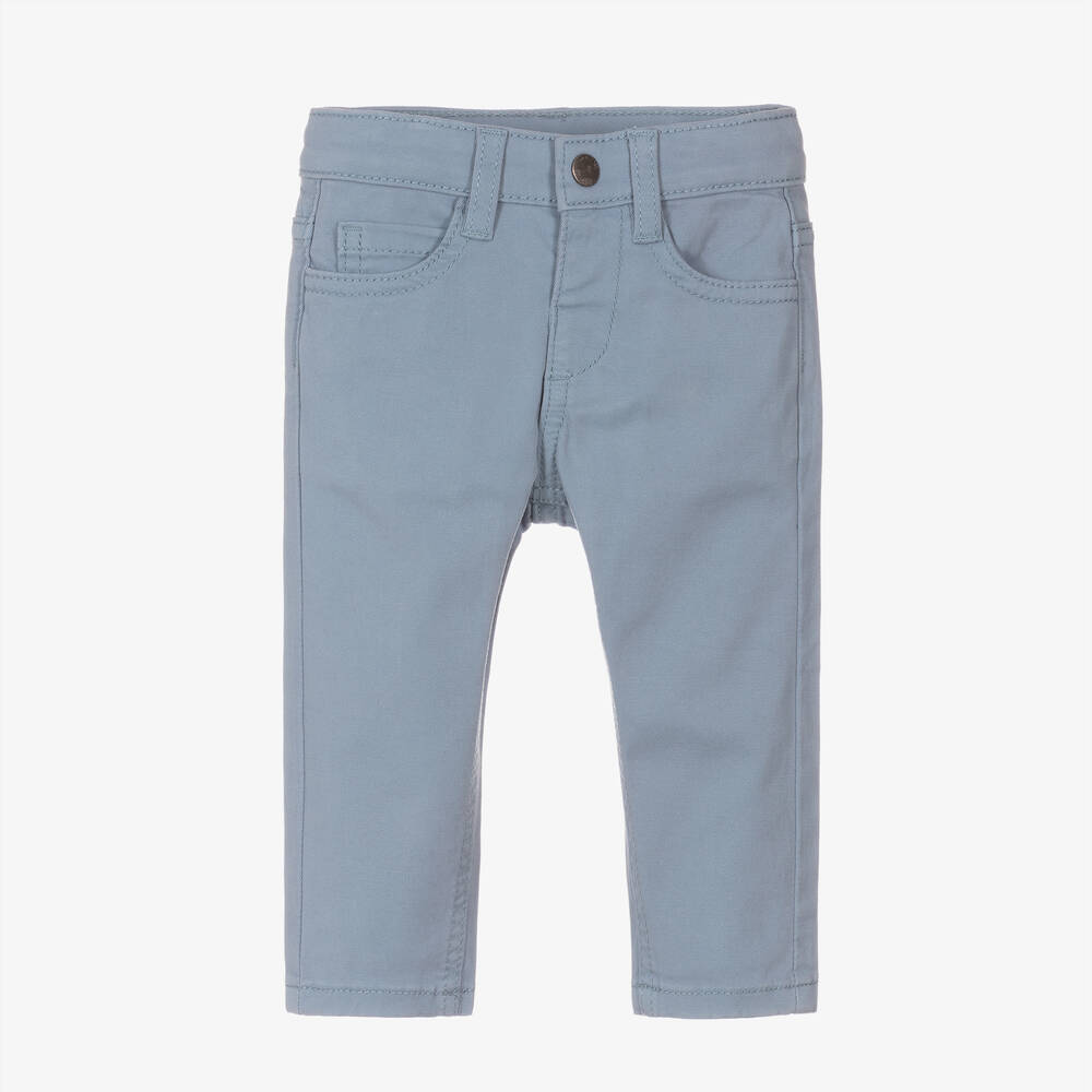 Голубые брюки для малышей от Mayoral из мягкого хлопкового твила с добавлением эластана. Эти повседневные узкие брюки, стилизованные под джинсы, имеют пять карманов и логотип на задней части пояса. Застегиваются на фирменную кнопку и имеют регулируемую талию для дополнительного комфорта.