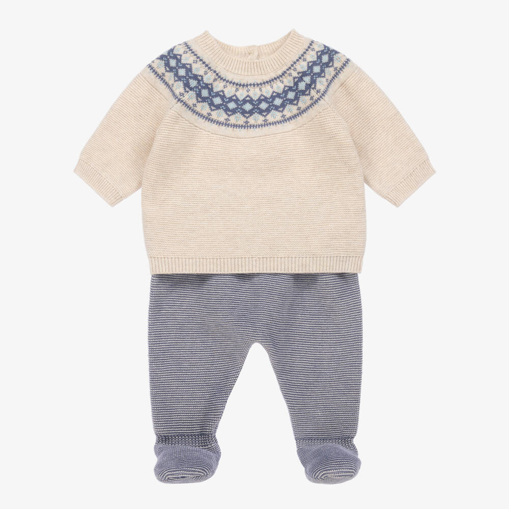 Adorable two-piece babygrow for boys from Mayoral, knitted in soft cotton. Lightweight yet cosy, the crew neck top has a lovely blue Fair Isle pattern and button fastenings on the back. It pairs with blue striped bottoms that have a gently elasticated waistband for comfortable wear.