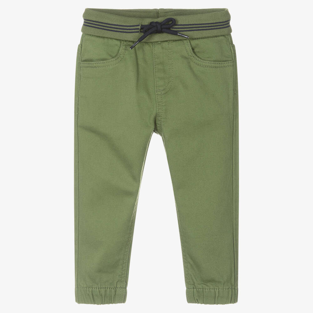 Green jogger style trousers for little boys by Mayoral, made in soft and stretchy cotton twill. They have front and back pockets and a ribbed, drawstring waist with a navy blue striped trim.