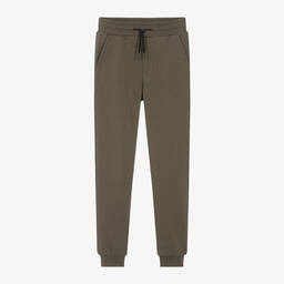 Khaki green cotton joggers for older boys by Mayoral Nukutavake, with a small tonal logo print on the front adding a subtle designer touch. Made in soft jersey for comfortable wear, they are casually styled with slanted front pockets and a patch pocket on the back. They have extra durable knees for longer-lasting wear and to ensure a great fit, there are drawstring ties on the elasticated waistband.