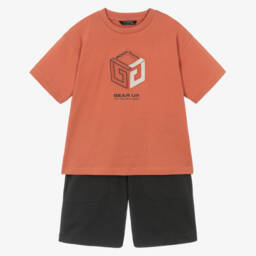 Casual cotton jersey shorts set for older boys by Mayoral Nukutavake, in shades of green and grey. The crew neck tee has gaming-inspired slogans and a cool, embossed design on the front. Easy to wear, the pull-on shorts have useful zipped front pockets and a drawstring waist for an adjustable fit.