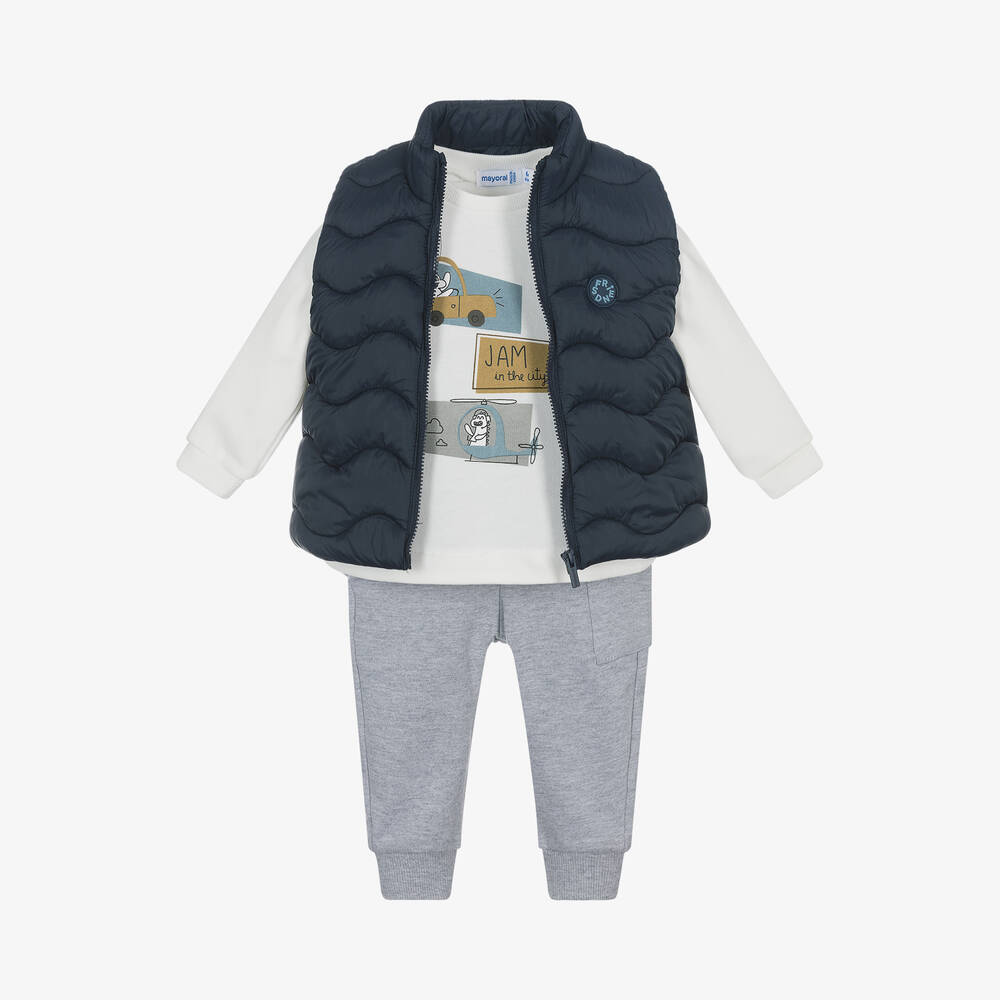 A casual and comfortable trouser set for little boys by Mayoral. The ivory sweatshirt and the grey marl joggers are made in a soft cotton-blend jersey, with a cosy fleecy inside. The sweatshirt has a fun 'Jam in the City' motif on the front, with popper fastenings on one shoulder. The trousers have an elasticated drawstring waist and durable reinforced knees. Providing an extra layer of warmth, the set is completed with a silky smooth, navy blue puffer gilet.