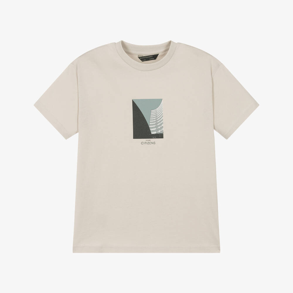 Older boys grey cotton T-shirt for casual days by Mayoral Nukutavake, made in soft, comfortable jersey. With a metropolitan feel, it has a city scape print on the front and the words 'Future Citizens' below.