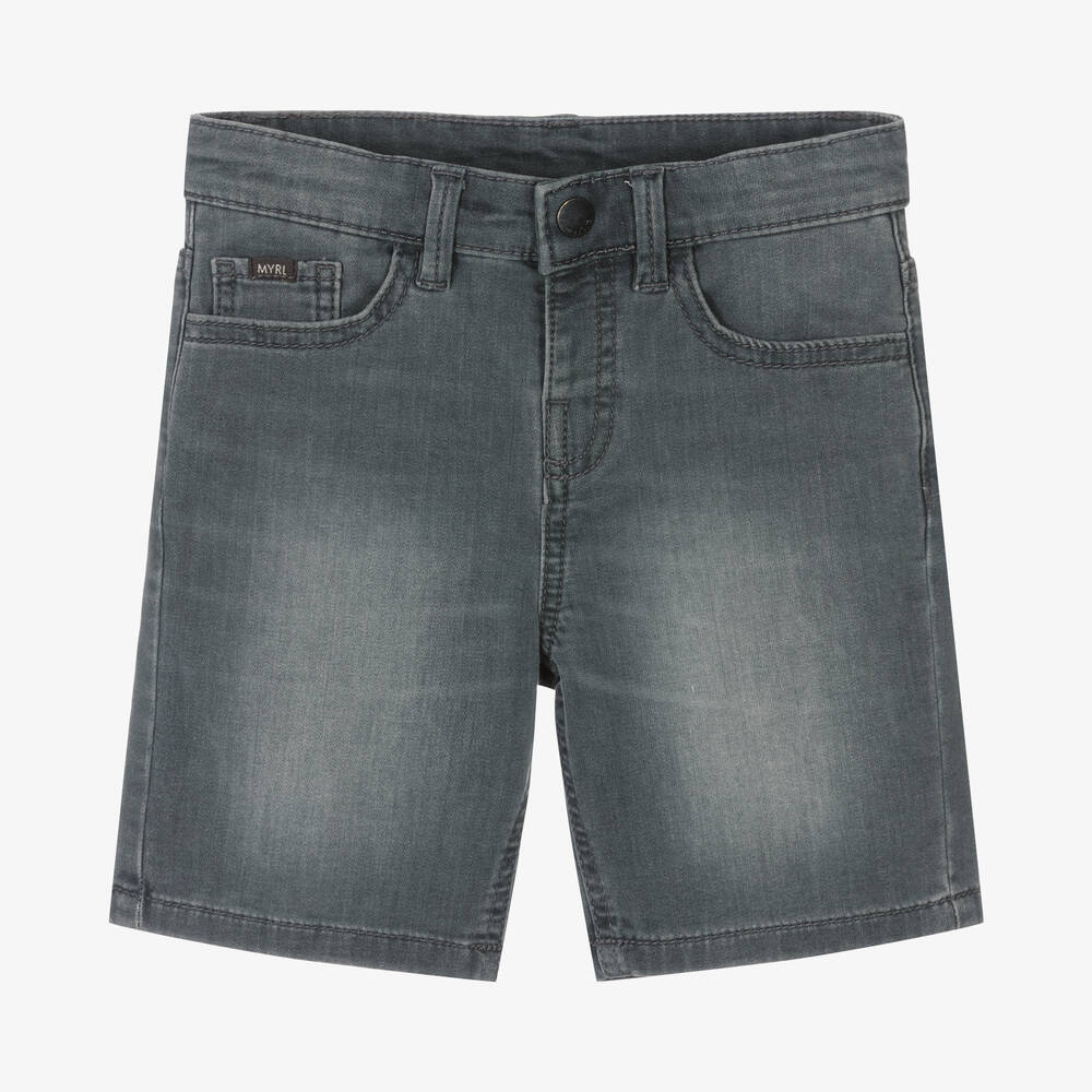 Dark grey denim shorts for boys by Mayoral, made in soft sustainable cotton, with a washed and worn look. Classically styled, they have five pockets and a black logo patch on the back. They fasten conveniently with a single popper and have a useful adjustable waist for a good fit.