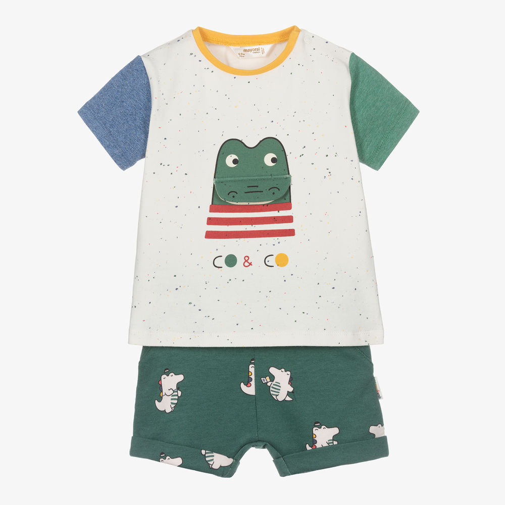 An ivory and green shorts set for baby boys by Mayoral, made in soft, sustainable cotton jersey. The top has green and blue sleeves and the front has a fun crocodile interactive motif. There are popper fastenings on the shoulder. The green sweatshirt shorts have an ivory crocodile print with a faux drawstring.