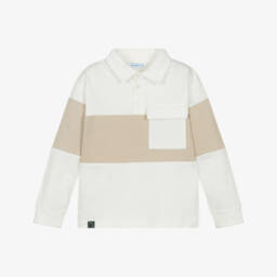 Рубашка поло в стиле регби для мальчиков от Mayoral в синем и бежевом цветах. Эта повседневная модель из мягкого хлопкового трикотажа имеет классический воротник, нагрудный карман и спортивный разрез по бокам. Застегивается на пуговицы спереди.