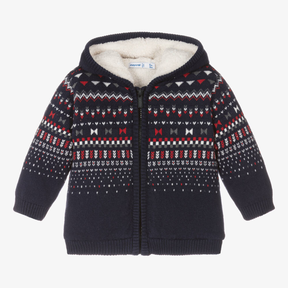 Navy blue cardigan for little boys, by Mayoral. Knitted in a soft cotton and wool blend, this seasonal top has a red and grey fairisle pattern on the front and back. Lined in soft sherpa fleece for cosy warmth, it fastens with a smooth zip and has stretchy trims for comfort.