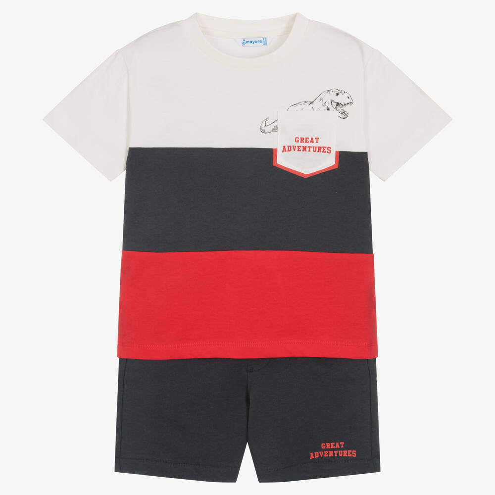 Red and navy blue sustainable cotton shorts set for boys by Spanish brand Mayoral. It is made in comfortable jersey for all-day wear and has an adventure theme. The ivory, navy blue and red striped T-shirt has a fun dinosaur print behind the chest pocket. The navy blue shorts have a drawstring waist for a good fit, with useful concealed side pockets and a back pocket. Easy to wear, the set just pulls on.