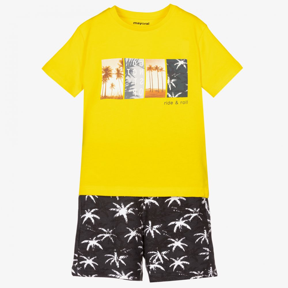 Two piece yellow and black shorts set for boys by Mayoral, made in soft cotton jersey. The yellow T-shirt has a 'Ride & Roll' palm tree print on the front in orange, green and grey. The washed black shorts have a white palm tree print, with a ribbed drawstring waist.
