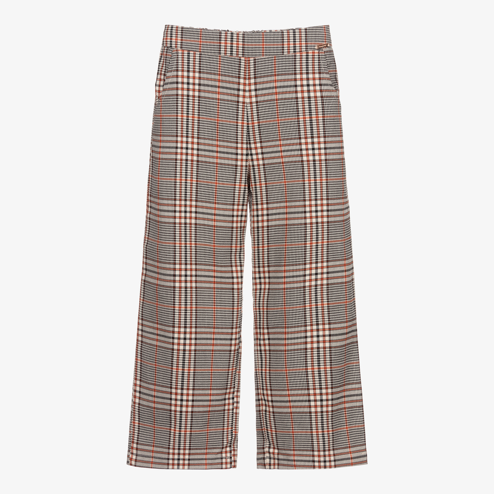 Stylish high waisted cropped trousers for girls by Mayoral, in a brown and orange check. They are made in a lightweight viscose blend, with side pockets and a partly elasticated waistband.