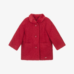A smart beige coat for little girls by Mayoral, made in soft and cosy bouclé. It features a plush faux fur collar and two slip pockets on the front. There are large button fastenings and a cotton lining for added comfort.