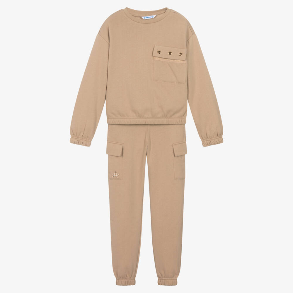 A beige tracksuit for girls by Mayoral, made from soft, mid-weight cotton jersey. The sweatshirt has elasticated trims for a cosy and relaxed fit. A pocket is featured on the chest, with gold eyelets and a 'You are Just Amazing' trim. The joggers have a faux drawstring on the elasticated waistband, with side seam and cargo-style pockets, and a gold 'Girl Pwr' charm.