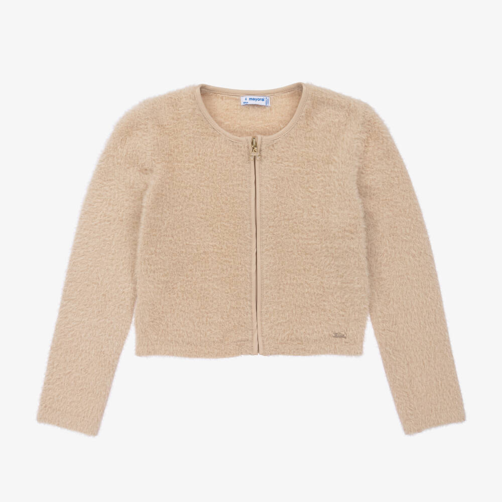Soft and fluffy, this beige knitted cardigan for girls is by Spanish brand Mayoral. An elegant layering piece, it has a collarless neckline, soft faux leather trims and a little metal logo plaque by the hem. The cardigan simply zips up, with an enamelled bow charm on the pull tab for a girly finishing touch.