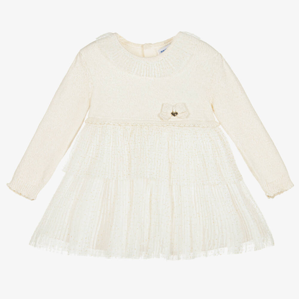 A lovely beige dress for little girls by Mayoral, with a knitted bodice and a tulle skirt. Decorated with gold thread throughout, the bodice is trimmed with a knitted bow and a heart-shaped logo charm on the front. Finely pleated, the layered skirt and matching ruffle collar are patterned in glittery gold dots. The dress fastens with buttons on the back and has a delicate cotton voile lining for comfort.