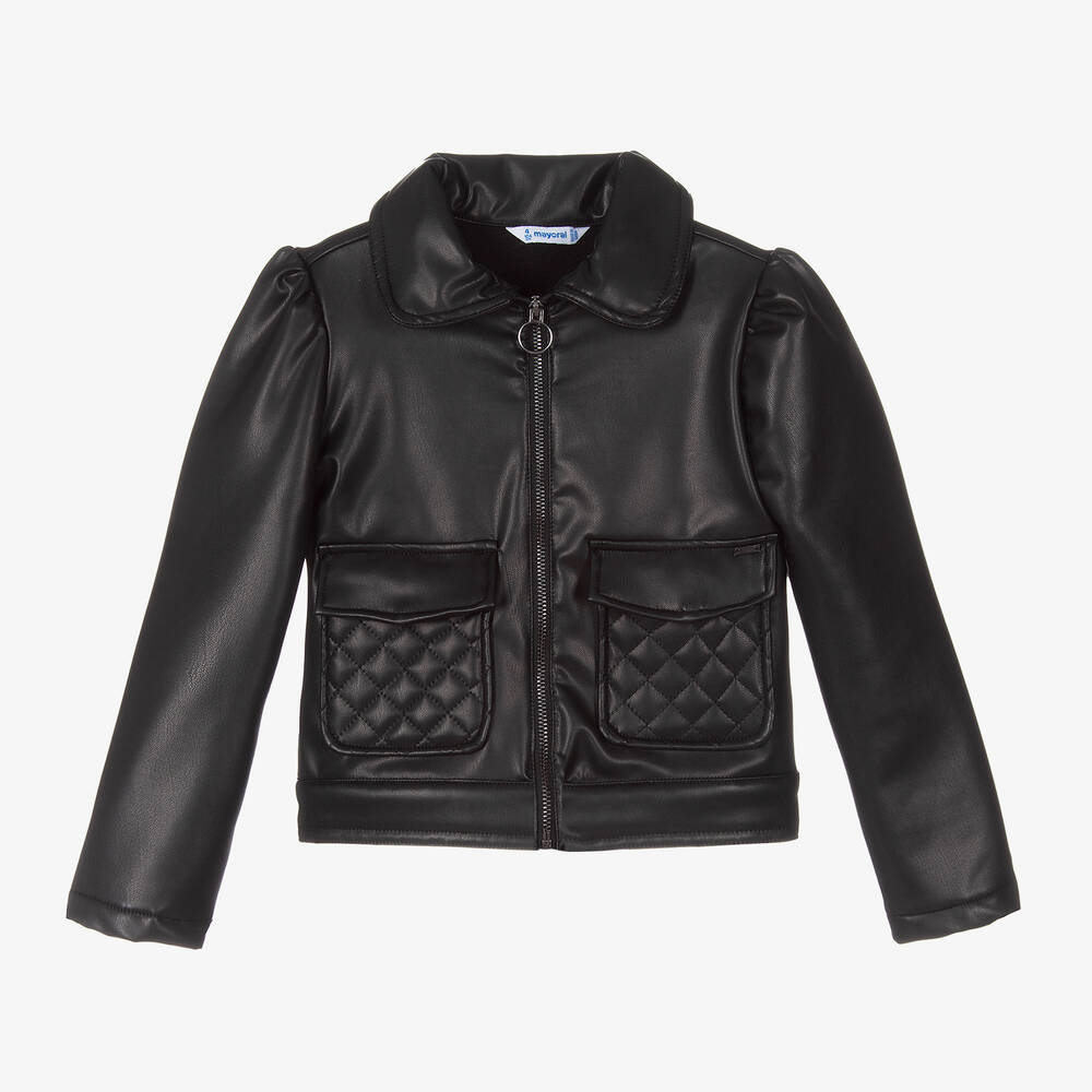 Stylish black jacket for girls, by Mayoral, made in soft faux leather. It has cool quilted front pockets, a shiny black logo charm, and puffed sleeves for an edgy look.