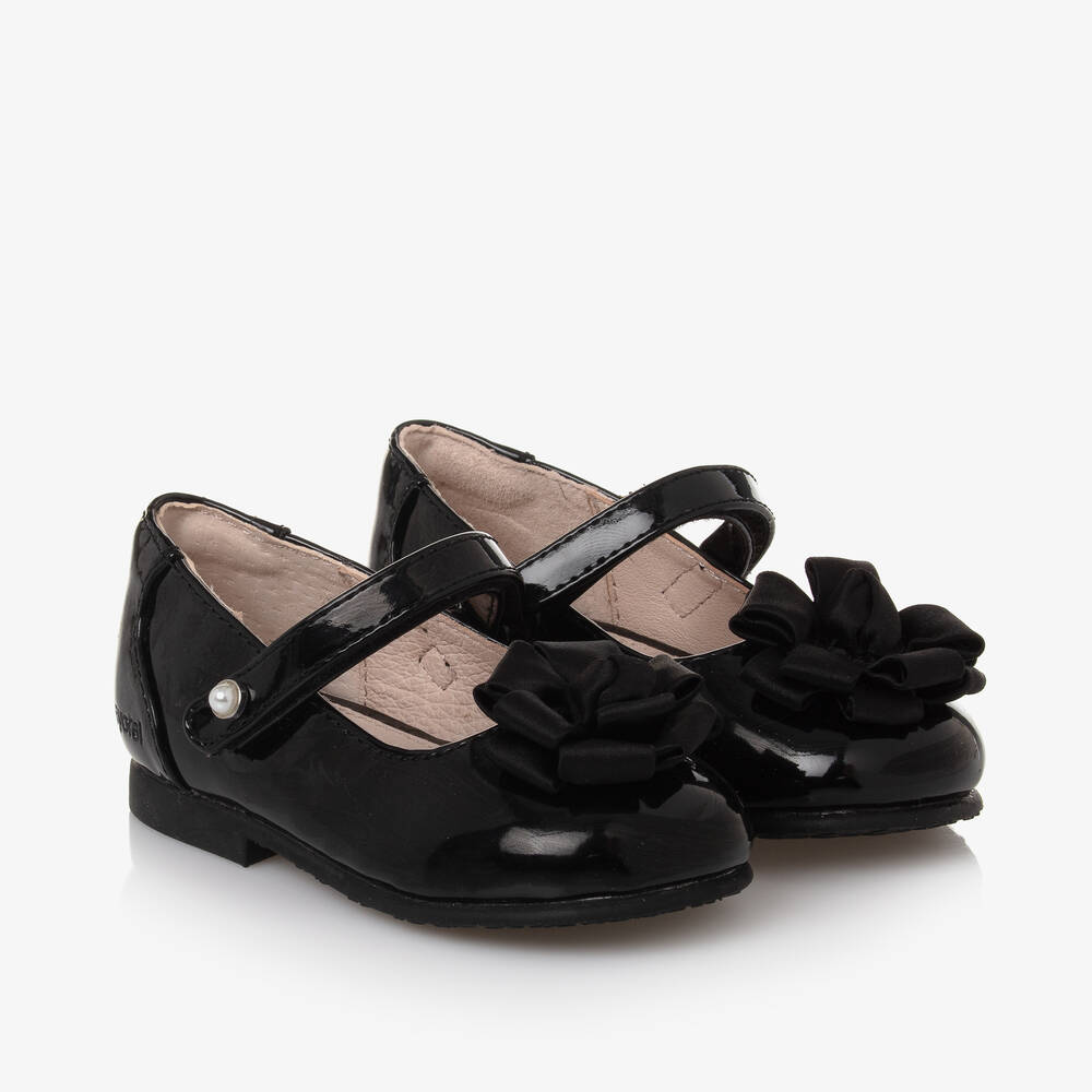 Smart black shoes for little girls by Mayoral, with a satin ribbon flower on the toes. Made in glossy faux patent leather, they have a smooth leather lining and a comfortable cushioned insole. They fasten with a velcro strap over the foot, and have a rubber sole for good grip.