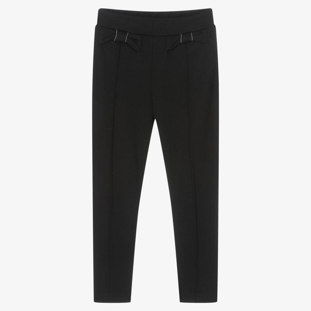 Comfortable black trousers for girls by Mayoral, made in soft and stretchy Milano jersey. They have front seam details and two pretty bows with shiny metal trims. The stretchy waistband is adjustable for an ideal fit.