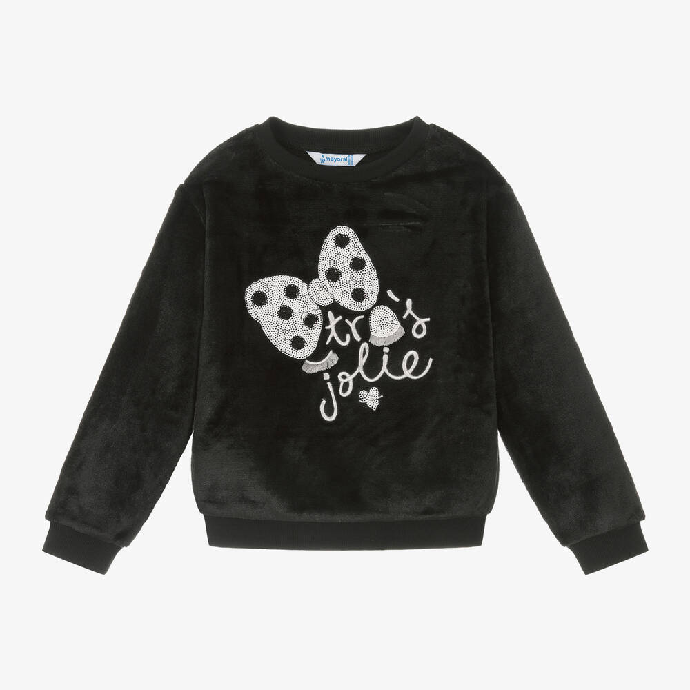 Черный свитшот для девочек от Mayoral из мягкого плюша, который приятно ощущается на коже. На этом повседневном топе синий и белый бантик из пайеток в горошек с тканевыми ресничками. Вышитый французский слоган переводится как 'Очень красивая'. Отлично подходит для согревания в холод, имеет удобные ребристые края и очень мягкую пушистую изнанку.