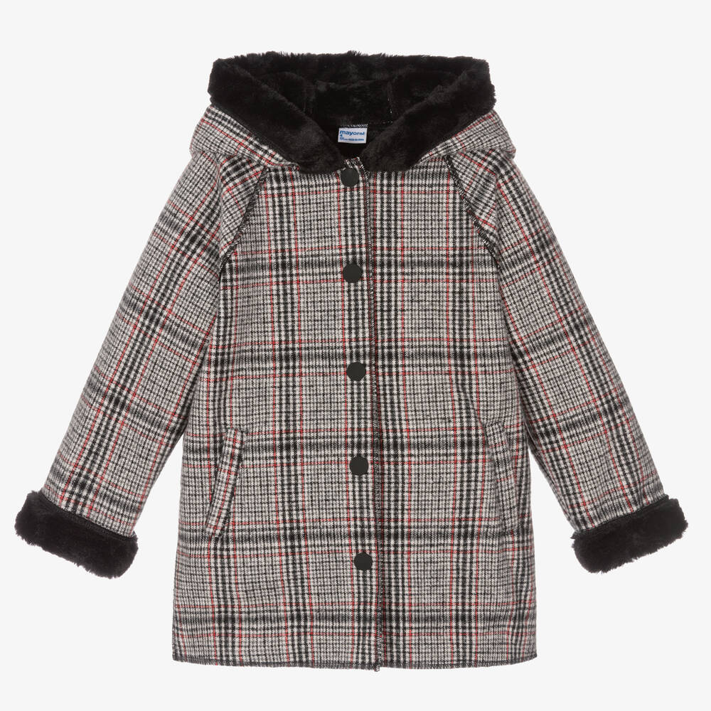 A black and red check coat for girls by Mayoral, in a super soft weave with a faux fur lining. Warm in colder weather, this coat has a cosy hood, front pockets and easy-to-fasten poppers on the front.