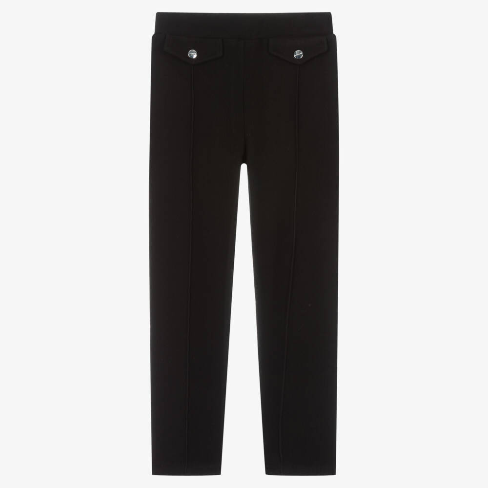 Black slim-fit trousers for girls by Mayoral. They are made in soft and stretchy, ribbed viscose-blend jersey for an elegant drape. They have faux front pockets with silver-tone decorative buttons and a softly elasticated waist for comfort.
