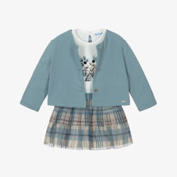 Этот очаровательный синий комплект из трех предметов для девочек от Mayoral предлагает стильный и гармоничный образ. Длинный рукав топа украшен милым цветочным рисунком спереди с бантиком и блестящим логотипом. Клетчатая юбка из тюля имеет мягкие складки и эластичный пояс для комфорта. Завершает наряд синий кардиган с серебристыми пуговицами в форме цветов.
