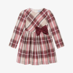 Smart dress for girls by Mayoral, made in a soft cotton and wool blend. Cosy and warm, it has a stylish checked tartan pattern in shades of blue and beige, with glittery silver threads, and a pretty, fixed navy blue velvet bow on the waistband of the gathered skirt. Fully lined for comfort, it fastens neatly on the back with a concealed zip.