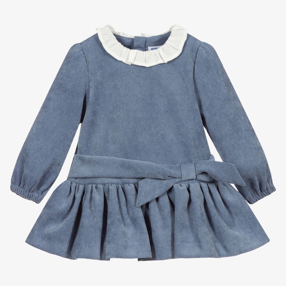 Pale blue dress for younger girls by Mayoral. Made in soft corduroy, it has a white ruffled collar and gently elasticated cuffs. Fully lined, there is an attached sash and bow on the front, with a gathered, drop-waisted skirt below.