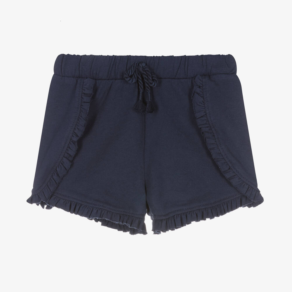 Navy blue shorts for little girls by Spanish brand Mayoral, made in soft sustainable cotton jersey. Cute and comfortable, they have ruffled trims and an elasticated waistband with a decorative drawstring tie.