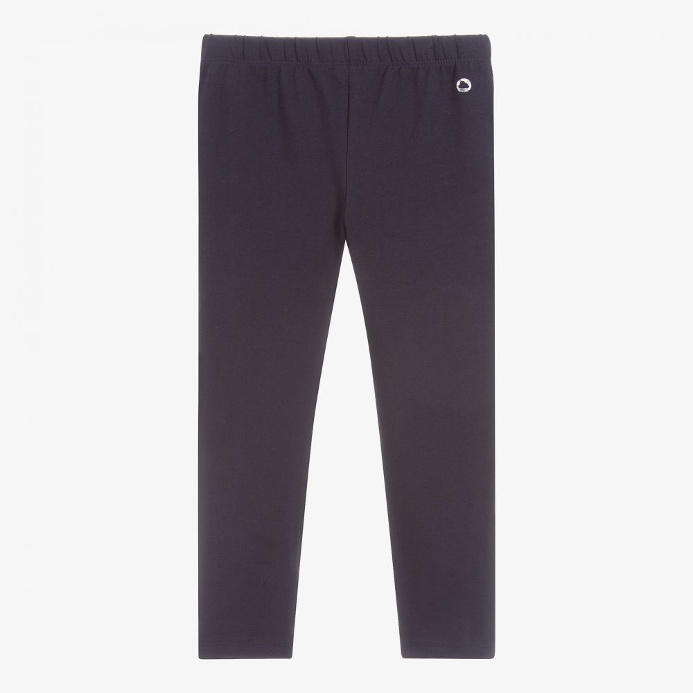 Girls navy blue cotton leggings by Mayoral. They are made in soft and stretchy jersey, with a silver logo printed by the elasticated waist.