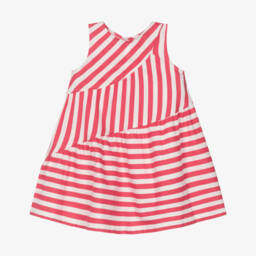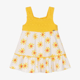 A lovely blue plumeti dress for baby girls by Mayoral, made in beautifully soft and lightweight cotton. Great for warm sunny days, the sleeveless dress has pintuck pleats on the front with a pearlescent logo charm in the centre. The ruffled detailing on the neckline has a white lace edge and there are button fastenings on the back for a neat finish. The dress is fully lined with cotton voile and can be worn with the matching knickers underneath.