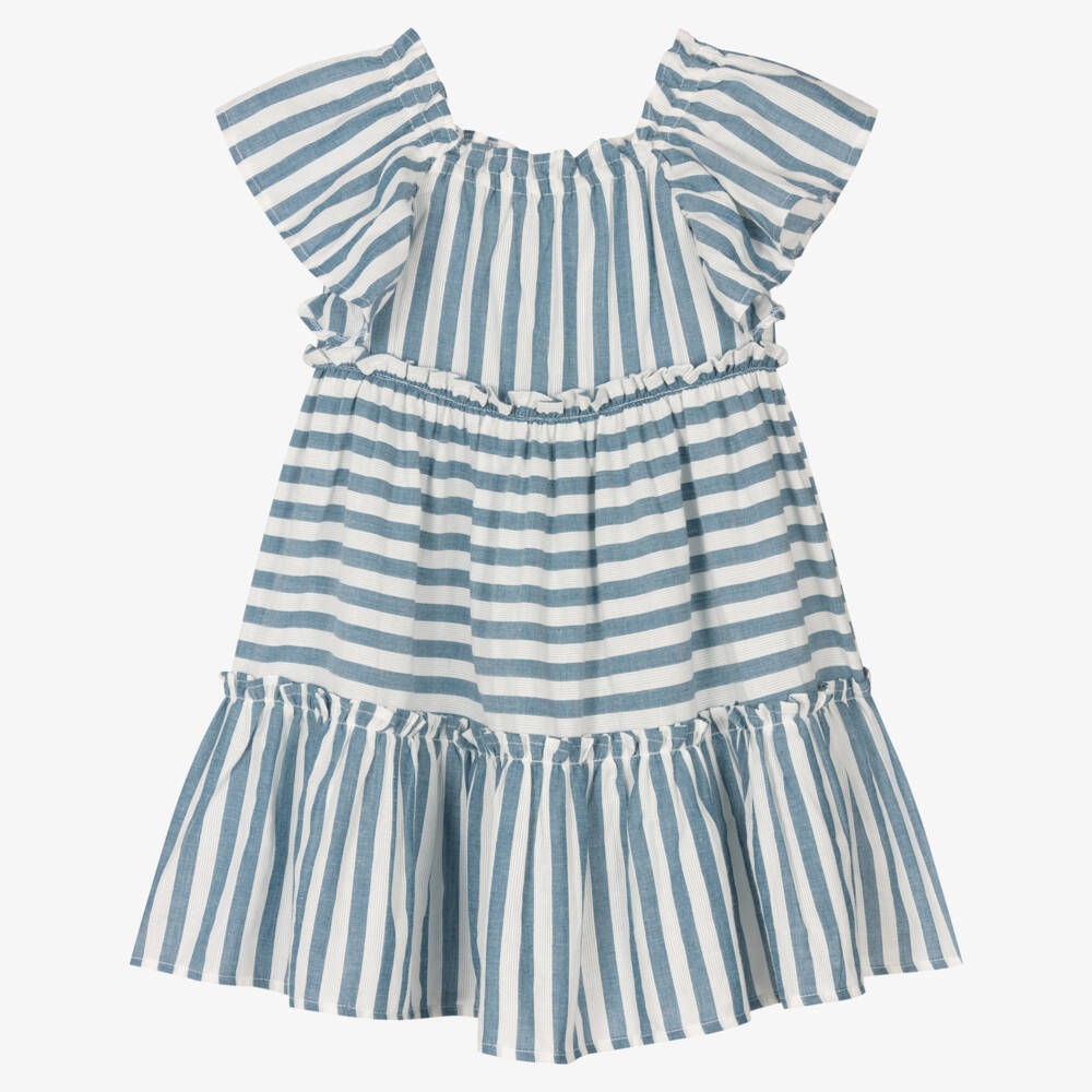 White and blue stripe dress for girls by Spanish brand Mayoral, made in soft and slightly sheer cotton. Lightweight and airy, this tiered dress has frilled sleeves and an elasticated neckline for creating a relaxed, off-the-shoulder style.