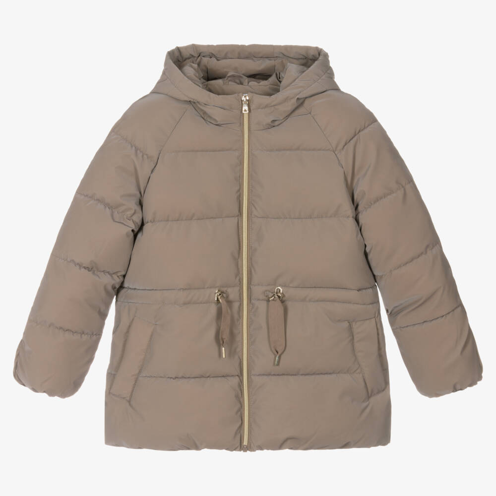 A brown puffer coat for older girls from Mayoral, with gold-tone hardware. This hooded coat is made in silky soft fabric and padded with mid-weight insulation for extra cosiness. It has convenient front pockets, a soft polar fleece lining for warmth and a drawstring detail on the waist for the ideal fit.