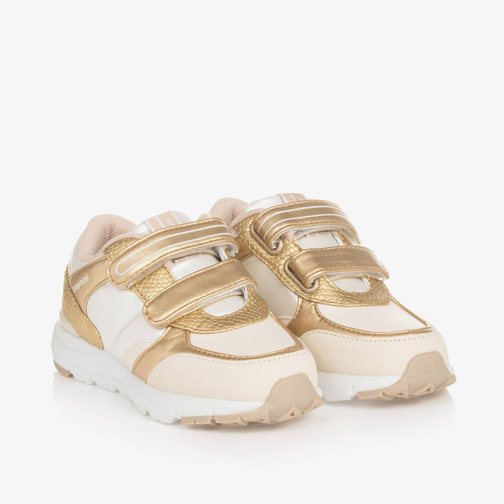 Gold faux leather trainers for girls by Mayoral, with beige and pearly ivory inserts. Stylish with a sporty vibe, they fasten with two adjustable velcro straps and have logo details on the tongue and heel. Anti-bacterial, odour-inhibiting and moisture-wicking, these comfortable trainers have a padded cotton piqué lining and removable, cushioned insoles. The flexible white and beige sole is textured for good grip.