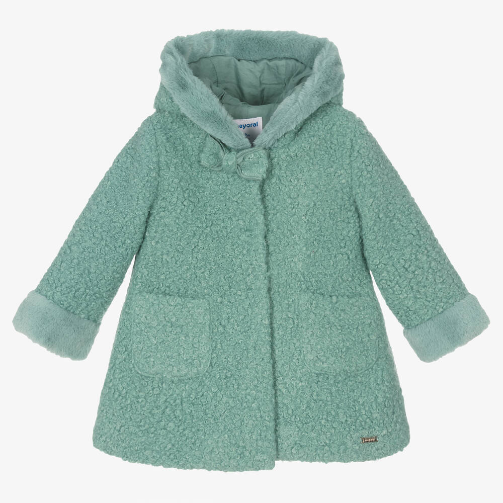 Adorable green coat for little girls, by Mayoral, made in soft and cosy bouclé. It has a sweet bow appliqué on the front, cosy plush trims, and a button fastening on the front for easy dressing.