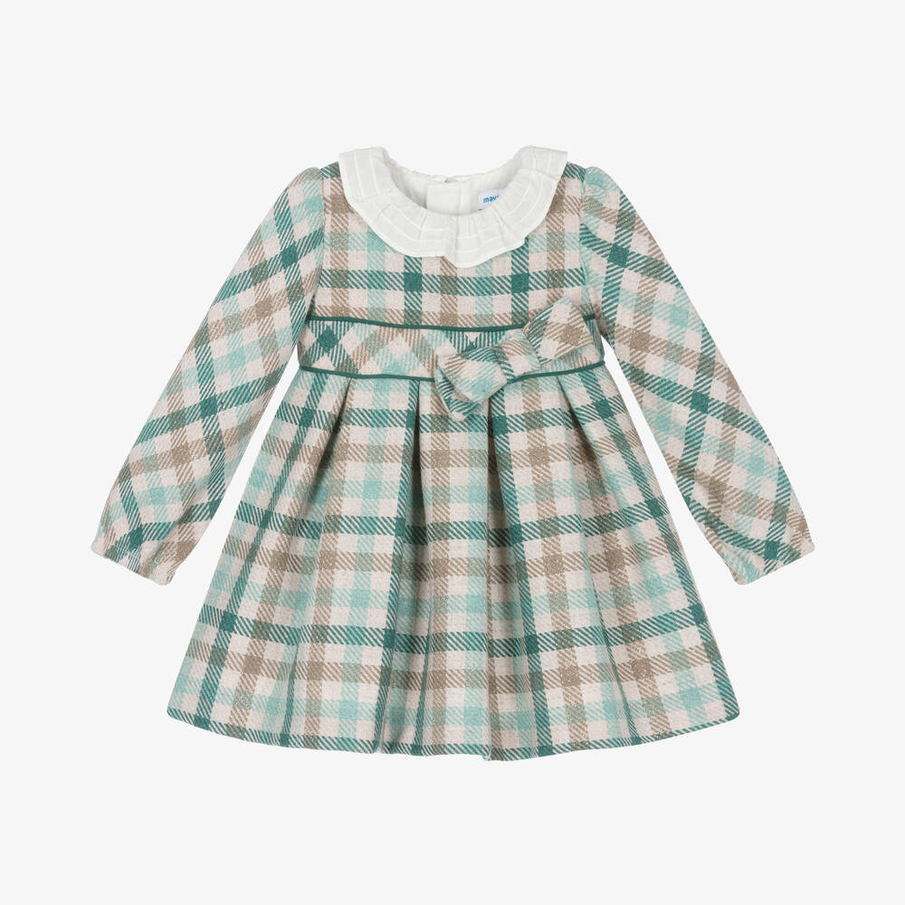A green and beige check dress for little girls by Mayoral. Woven in a soft cotton and wool blend with a subtle gold sparkle, it is lined with lightweight cotton for added comfort. The waistband has a pretty appliqué bow with branded detailing and green piping for a sweet look. Fastening with a concealed zip on the back, it has a white frilled collar and puffed long sleeves with stretchy cuffs for extra comfort.