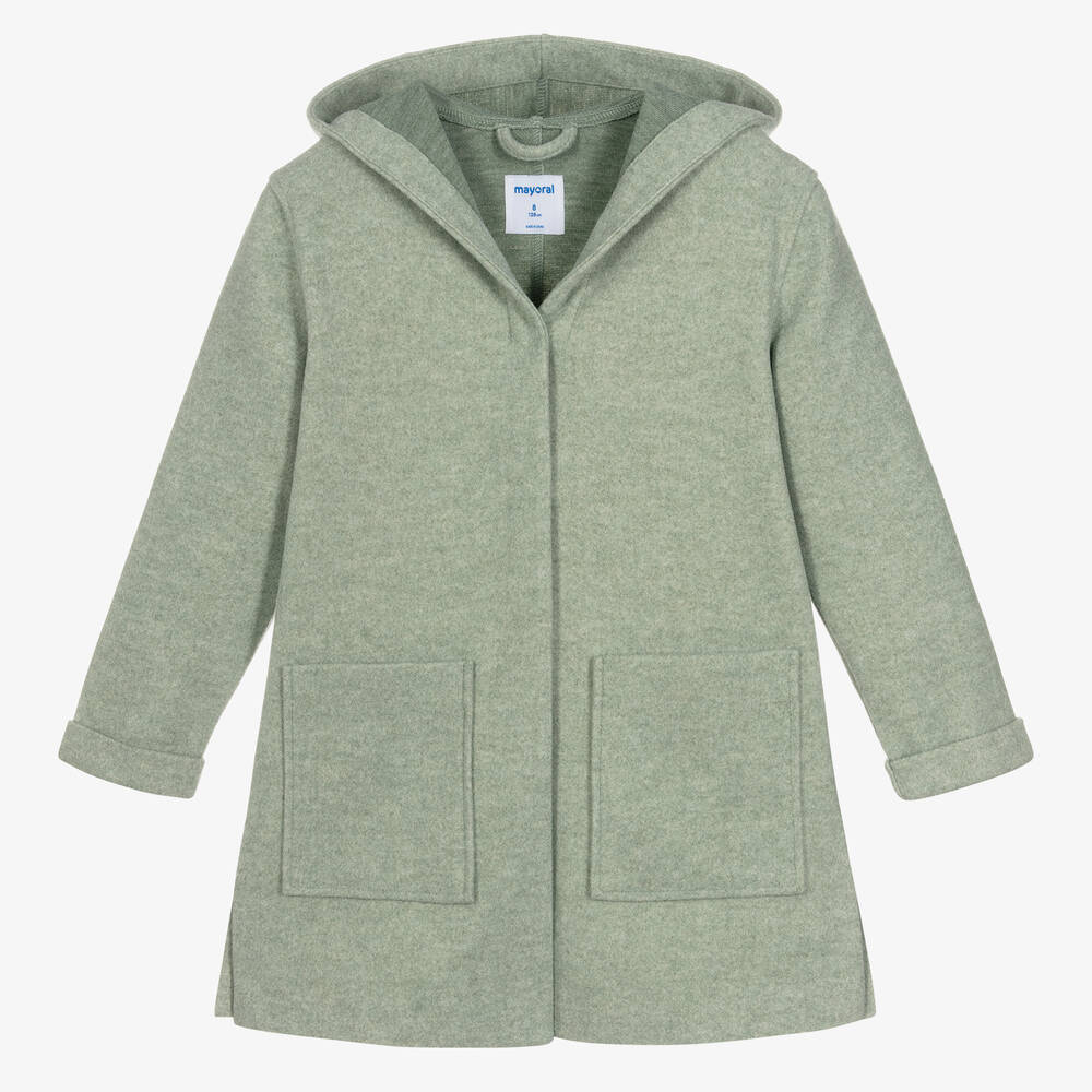 Stylish sage green coat for girls by Mayoral, made in a soft viscose blend with a felted wool feel. Cosy and comfortable to wear, it has a fixed hood and side vents for ease of movement. There are concealed front popper fastenings and large front pockets.