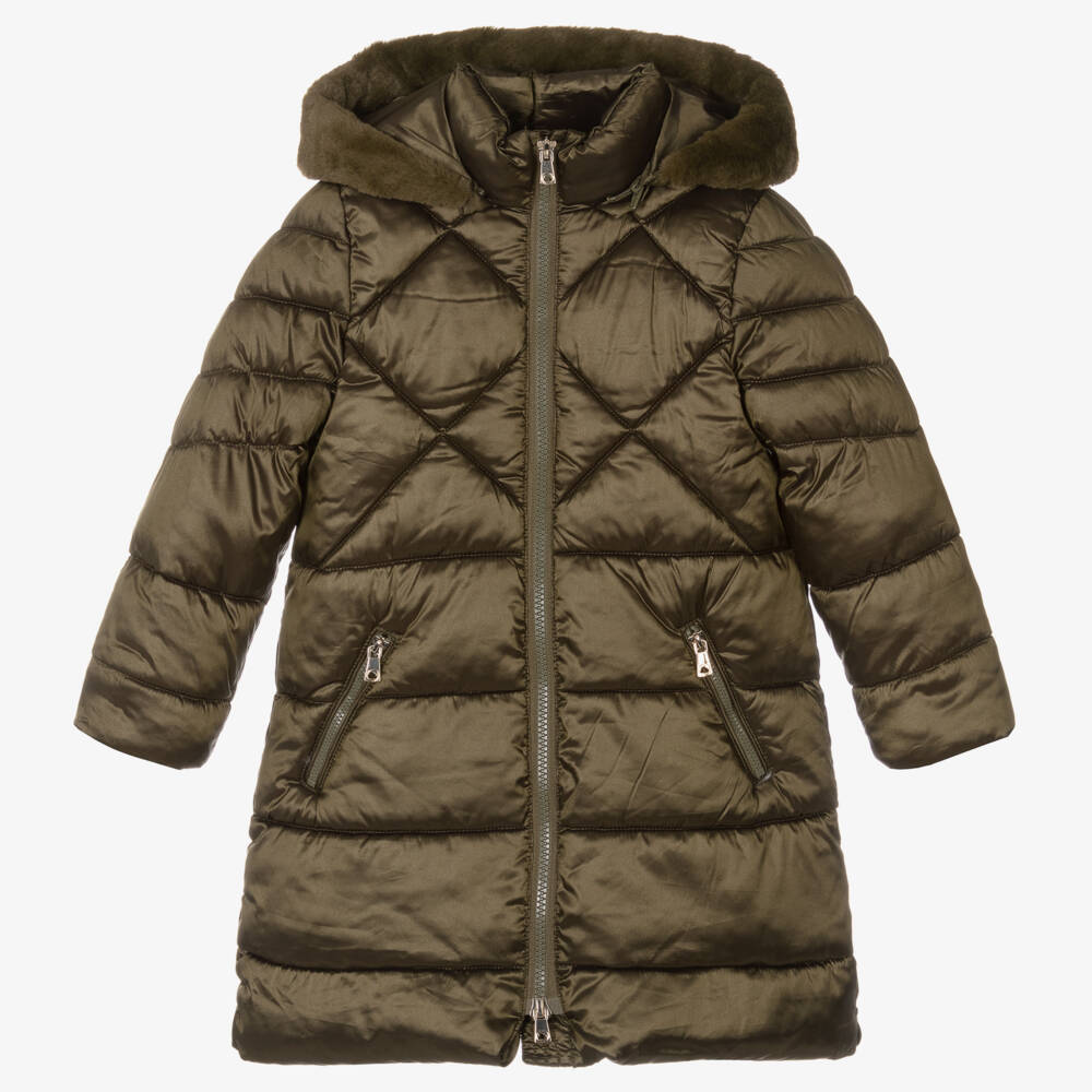 A green puffer coat for girls from Mayoral, with a lustre effect and gold-tone hardware. This hooded coat is made in silky-soft fabric and padded with cosy, mid-weight insulation. For versatile wear, the faux fur-trimmed hood is removable and secures with a zip. The body and zip-up pockets are lined with super-soft plush velour for added warmth.