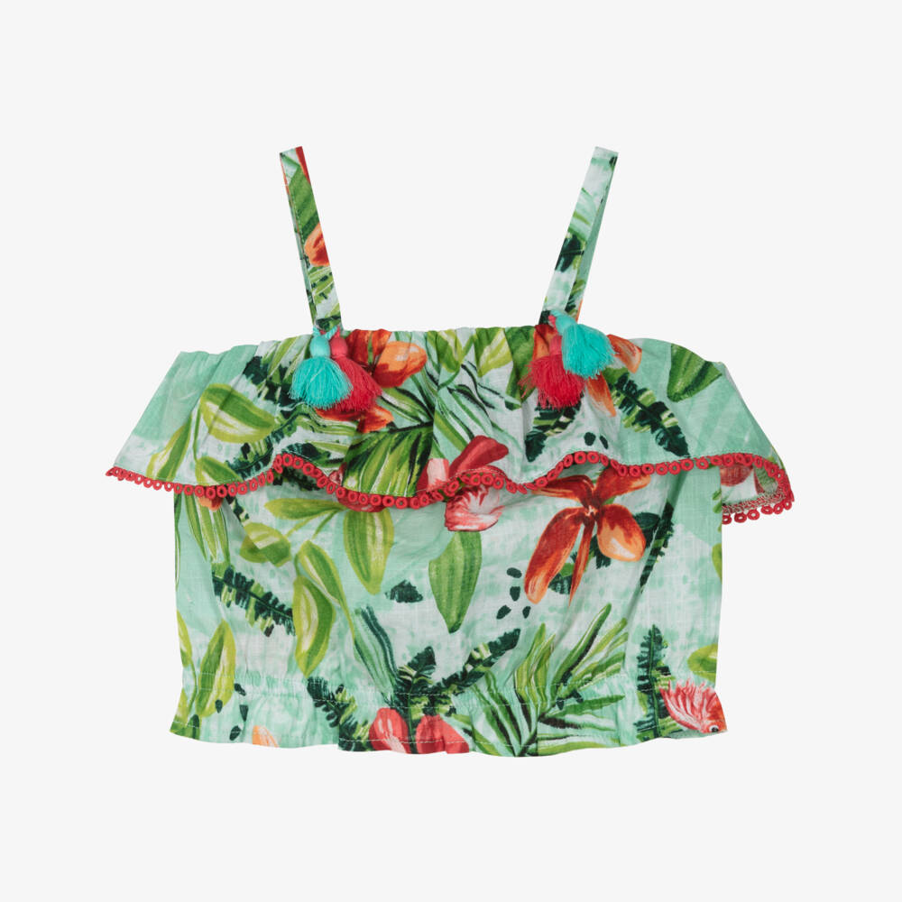 Green and orange cotton top for girls by Mayoral, with a tropical flower print. This cropped style has a lightweight feel and a pretty ruffle around the bodice. There are fun tassels on the shoulder straps and elasticated trims around the neck and hemline for a comfortable fit.