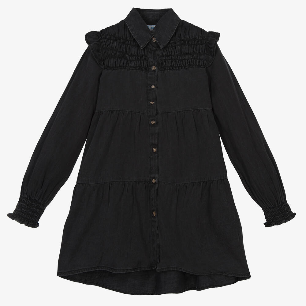 Pretty dark grey denim dress for girls by Mayoral, with ruching across the bodice and cuffs. Made in a lightweight cotton and lyocell blend, it has ruffles over the shoulders and gathered tiers on the skirt. It fastens with faux bone buttons on the front.