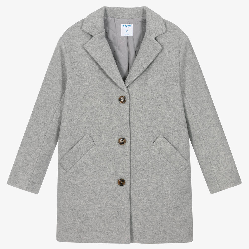 Lovely grey felted coat for older girls by Mayoral, with a soft wool feel. Faux tortoiseshell buttons fasten the front in a timeless style. It has a quilted lining for comfort, a vent on the back for ease of movement, and pointed lapels for a smart finish.