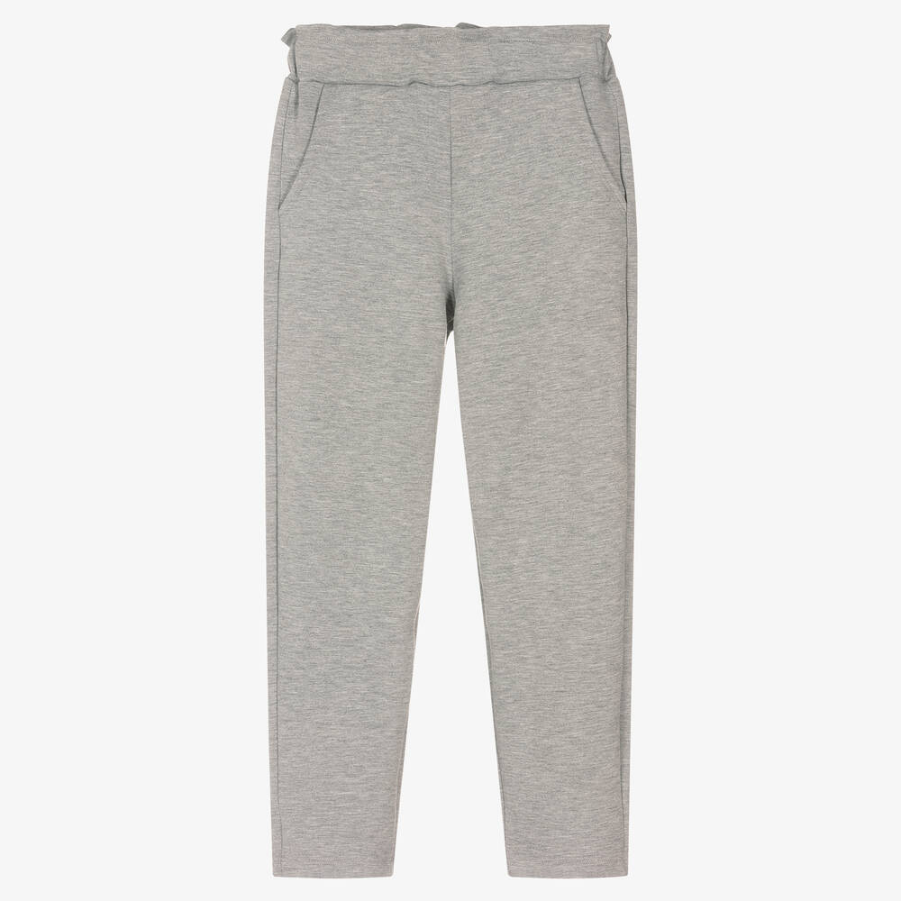 Grey marl trousers for girls by Mayoral, made in a soft polyester and viscose blend jersey. Easy and comfortable to wear, they have an elasticated waistband and useful front pockets