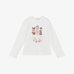Кремовый лонгслив от Mayoral с очаровательным рисунком трёх стильных девочек, украшенных блестящими пайетками. Отлично подходит для комфорта на каждый день, выполнен из мягкого хлопкового джерси с круглым вырезом и слегка присборенными плечами.