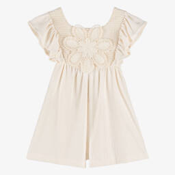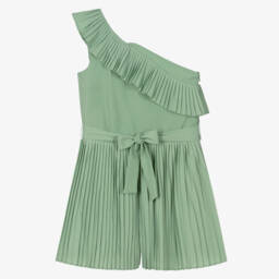 Lovely ivory playsuit for girls from Mayoral. It is made in soft and sheer crêpe chiffon in a yellow, pink and green floral print with a subtle gold pattern for a little sparkle. In an asymmetric one shoulder style, it has a pretty bow on the strap and a ruffle across the shoulder. It is gently elasticated around the waist and shoulder for easy pull-on and fully lined for added comfort.