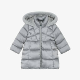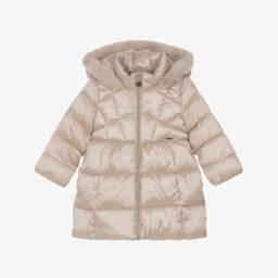 Cosy and warm for little girls, this dark ivory puffer coat is by Mayoral. Silky smooth with a lovely sheen, it is warmly padded and has a super soft velour lining and concealed side seam pockets. The fixed hood is trimmed with soft faux fur and the coat fastens with a zip on the front.