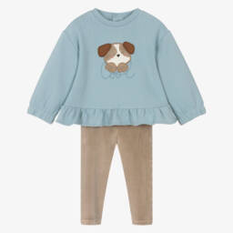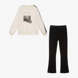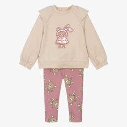 Offering casual comfort and style, this ivory and pale pink leggings set for girls is by Mayoral. Made in a soft cotton blend with a fleecy inside, the sweatshirt features charming pale pink velvet bows on the sleeves and a fun curved hem at the front. The slightly flared leggings are made in soft and stretchy velour for a cosy feel.