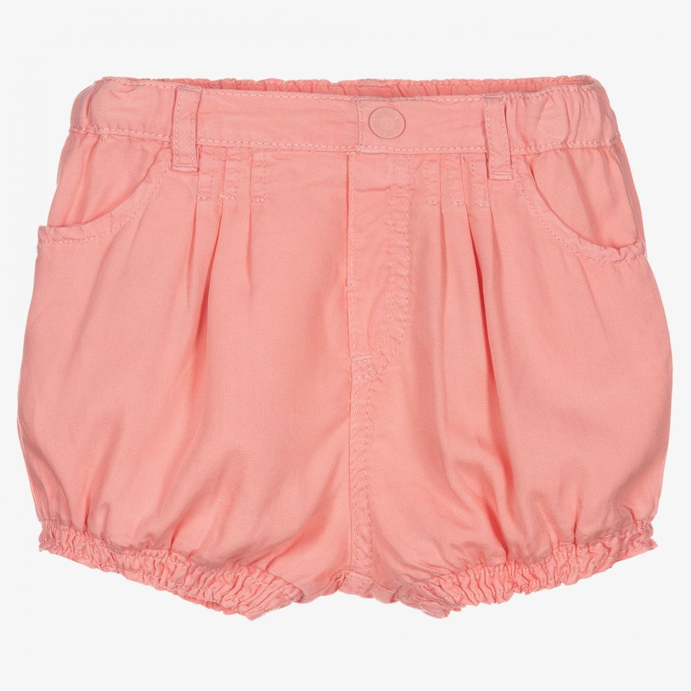 Cute pink bubble shorts for little girls by Mayoral, made in super comfortable, sustainable Tencel™ Lyocell. They have pleated detailing and pockets on the front, with shirred leg cuffs. Styled with a decorative logo button, the waistband is gently elasticated and adjustable.