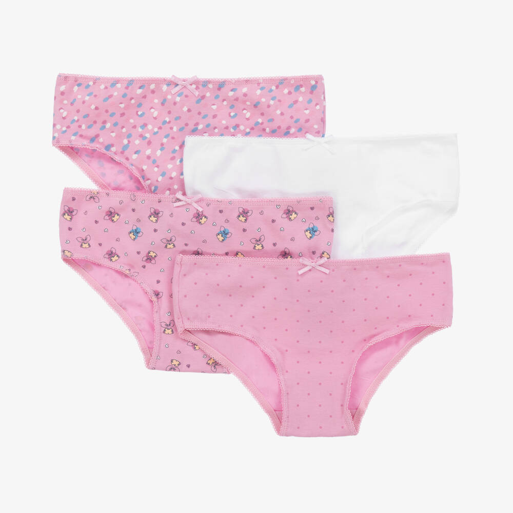 A pack of four pink and white knickers for girls by Spanish brand Mayoral, made from soft cotton jersey. Each pair has sweet picot trims, silky ribbon bow decorations, and comfortable elasticated waists. One pair is patterned with tiny polka dots, another has an abstract spot design, one is printed with cartoon girl faces and hearts, and the last pair is plain white.